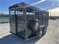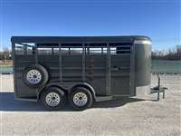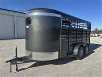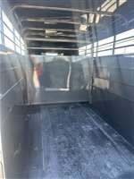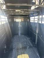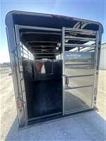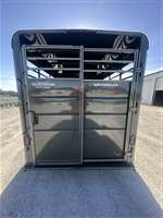 FEATURES: 2 - 3,500 lb. 6 bolt hub, Torsion axles with brakes on 1, ST235/80R/16" load range E 10 ply rated trailer radial tires with spare, 6'6" height, 54" solid sides with 3 air gaps at top, pressure treated pine floor, removeable wheel on jack, rear gate with slider, 1 solid divider gate with slam latch, access door on passenger side, tie rings inside and out, safety chains, break away battery and switch, aluminum treadplate gravel guard, LED marker lights, LED rubber mounted sealed beam tail lights. Color - Dark gray with silver stripes. Approx. empty weight 2560lbs
